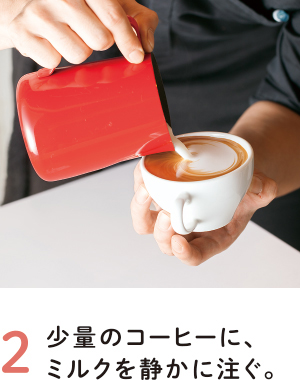 エスプレッソなど濃いめのコーヒーまたはココアを少量入れたカップに、近い位置から①のミルクを注ぐと、ミルクが表面にあらわれます。