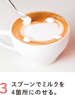 ラテアート用に残しておいた①のミルクをスプーンにとり、コーヒーの表面にのせるようにして、小さな白い丸を4箇所作ります。