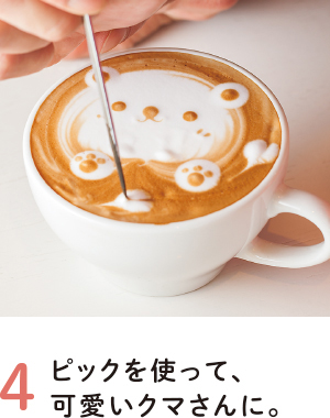 ピックの先にコーヒーをつけて、目や鼻など茶色いポイントを描けば、可愛いクマさんが完成。