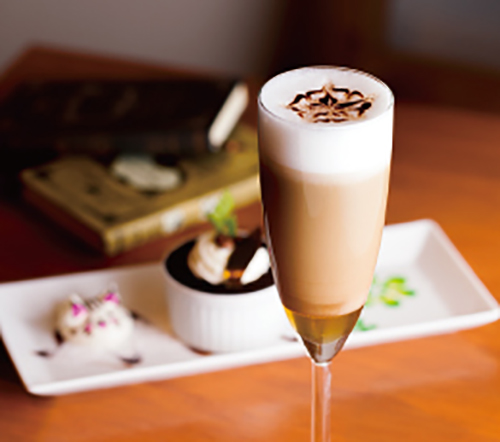 秋の夜長は、ほんのりお酒を薫らせたアレンジコーヒーで大人の時間を楽しむのも素敵です。加藤さんに教えていただいたのは、美しい3層のアレンジコーヒー。器もシャンパングラスを使えば、いつもと違った大人の雰囲気が演出できます。最初にハチミツ、続いてチョコレートリキュールを加えたコーヒー、その上にフォームミルクをのせて3層になるように注ぎます。仕上げにチョコソースをかけてできあがり。