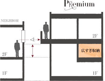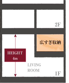 「マイホーム購入の決め手となりました」___そんなうれしい声を多数いただくのが、ヘスタホームPremiumの「広すぎ収納」です。広すぎ収納とは、家の階層構造の中2階に位置する場所を生かしたプラスαのマルチスペースのこと。天井高1.4mの「おこもり感が落ち着く」と好評で、大容量の収納スペースのほかにもシアタールームなど趣味の部屋や、お子様のプレイルーム、テレワークスペースなど、アイデア次第でいろいろな使い方が楽しめます。