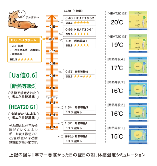 ヘスタホームはZEHレベルのUa値(*)0.6を基準に考えています。