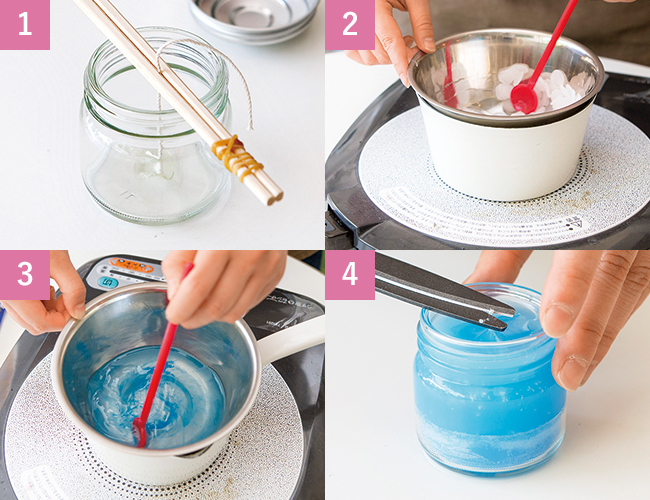 瓶に❸のロウを流し込み、冷やします。完全に固まってから、はさみで芯の長さを整えて完成です。