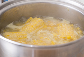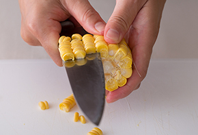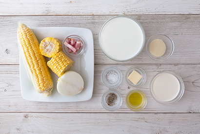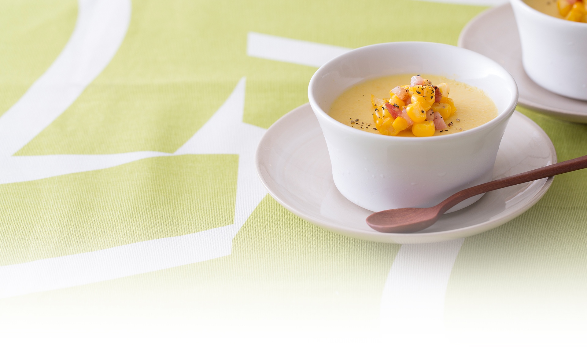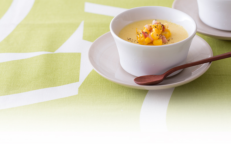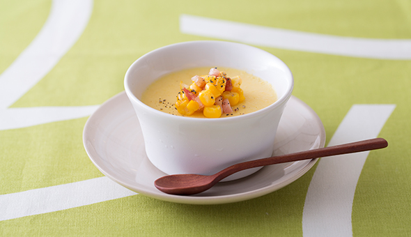 パンナコッタが固まったら、トッピングのとうもろこし、ベーコン、黒胡椒を振って盛り付けすると見た目が豪華になります。固める器もグラスにしたり、大きく固めたり。アレンジしてみてください。