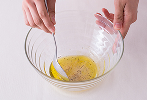 ボウルにレモン汁・オリーブ油・塩こしょうを合わせておきます。