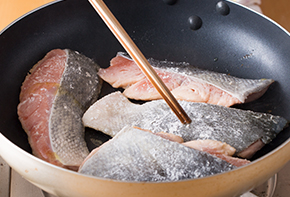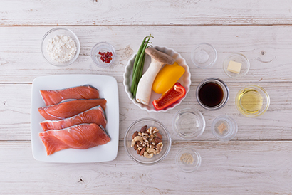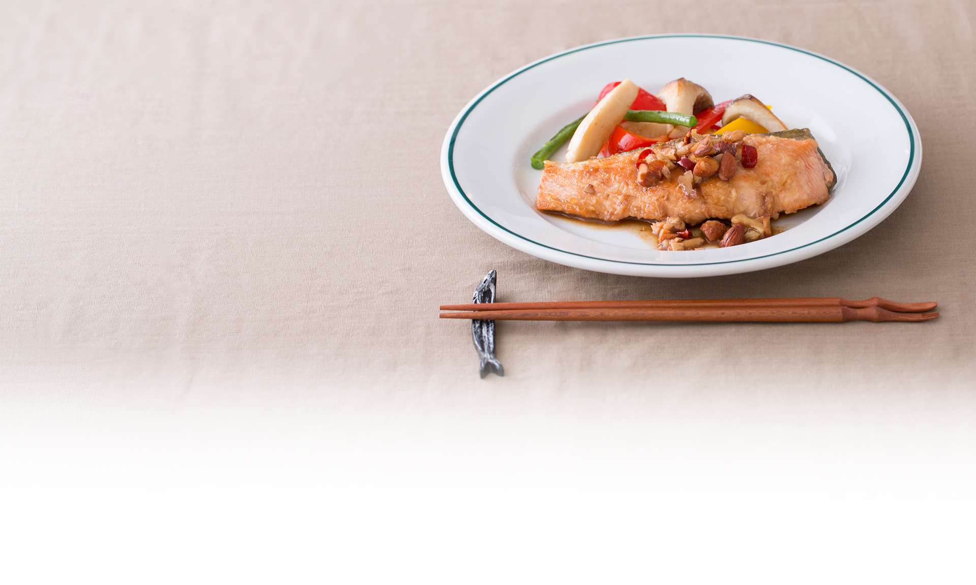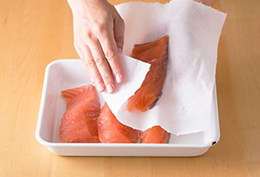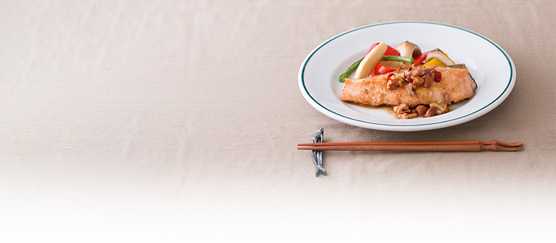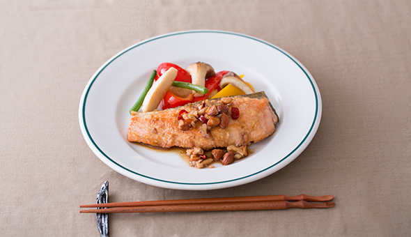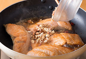 付け合わせと鮭を器に盛り、ソースをかけて仕上げます。旬の秋鮭を使用しましたが
