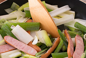 長ネギは5cmの長さに切ってから縦半分に切ります。ソーセージは縦に2等分くらい。焼き時間はオーブンによって加減してください。