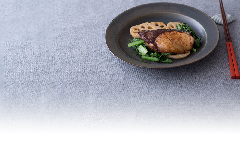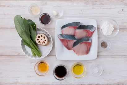 器に炒めた小松菜と、れんこん、ブリをのせます。ソースを上からかけて完成。