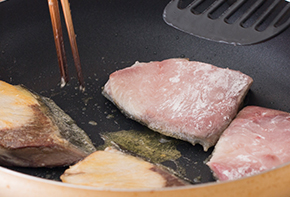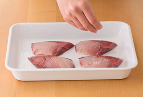ブリを拭いて水気を取り、薄く小麦粉をつけます。