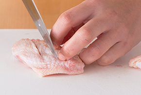 手羽中の先の部分は関節に包丁を入れて切り落とします。味が染み込むように皮目に3か所、反対側の骨の間に1か所切込みを入れておきます。