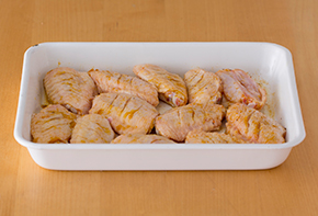 手羽中にカレー粉などの香辛料で下味をつけて二度揚げします。