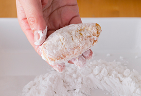 ②の余分な水分を拭いて片栗粉をたっぷりとつけ、余分な片栗粉はおとします。