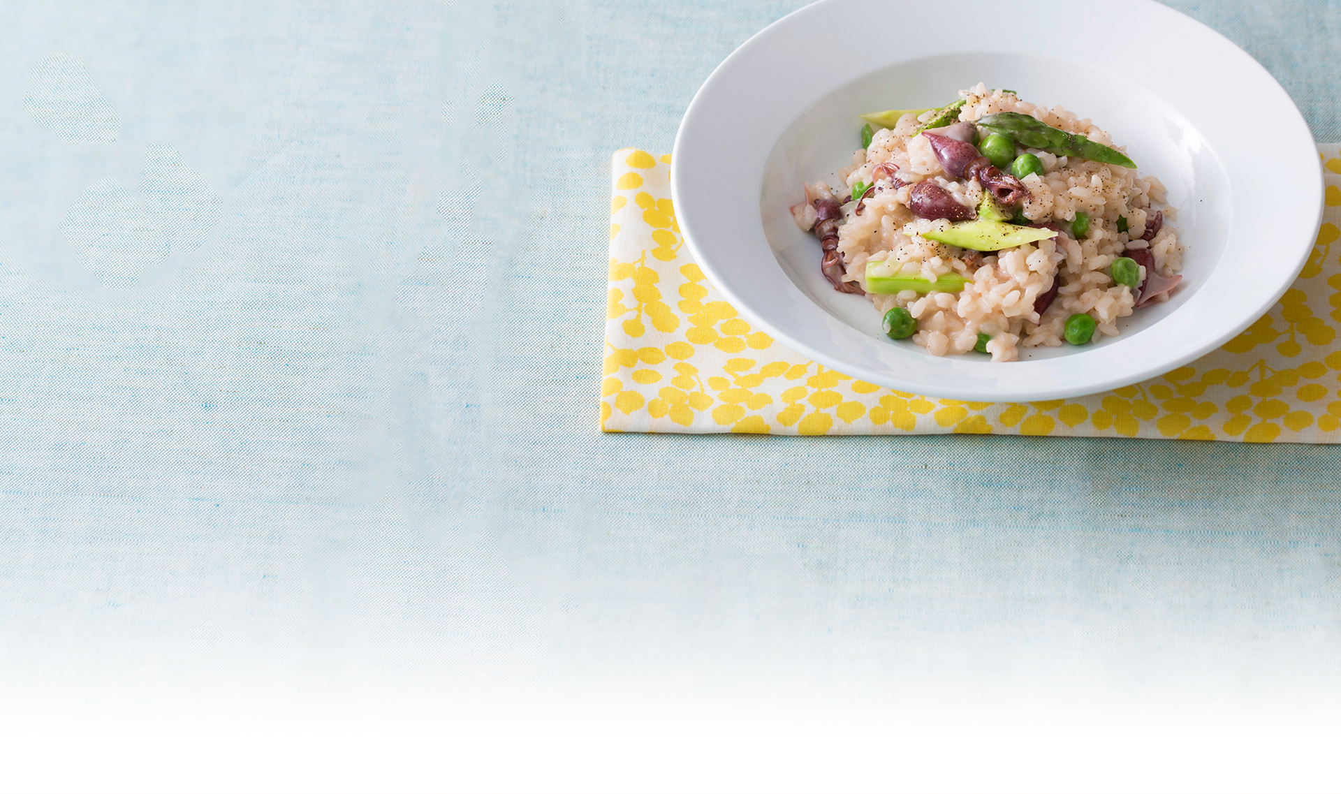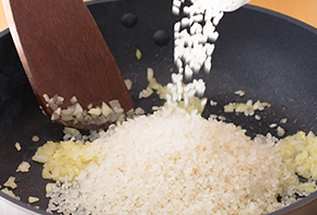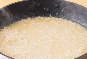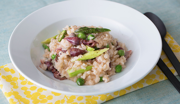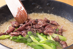 粘りの出ないように仕上げるために温かいスープを何度かにわけてひたひたに加えることと、米を混ぜ過ぎないことがポイントです。ホタルイカを軽くつぶして混ぜると旨みとコクがでます。