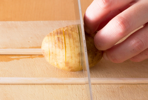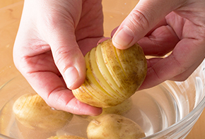 じゃがいもはよく洗い、割りばし等を使って最後まで切り落とさないように注意し、切込みを入れます。(端は切り落としやすいので注意してください。)
