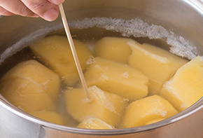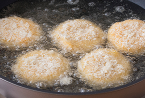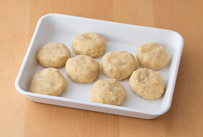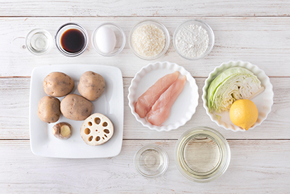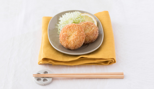 きつね色になるま揚げてカリッとしたらよく油をきって取り出します。付け合わせに千切りのキャベツとレモンを添えて盛り付けます。
