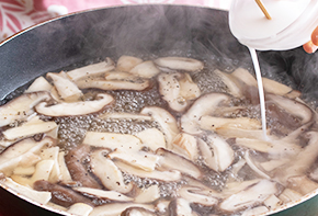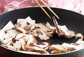 フライパンをさっとふいてサラダ油を熱し、エリンギ・しいたけを炒めます。