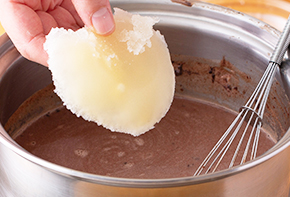 小鍋に牛乳を入れて軽く温め、②、ココアパウダー、砂糖を入れてよく混ぜ、沸騰直前で火を止めます。