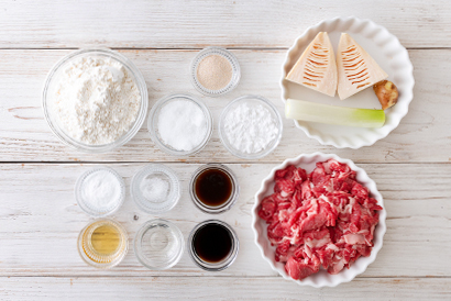 牛肉は細かく切り、たけのこは粗みじん切り、長ねぎ、生姜をみじん切りにします。ボウルに入れて調味料[A]を加えて練ります。