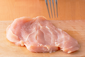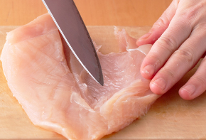 鶏むね肉は皮と余分な脂肪を取り、皮がついていた方とは反対側の真ん中に縦に切込みを入れて両側に切り開き、厚みを均一にします。(観音開きに切ります。)