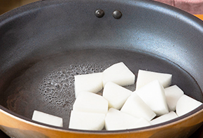 大根は2cm厚さのいちょう切り、ブロッコリー、カリフラワーは小房に分けて他の野菜は食べやすく切ります。フライパンに大根を入れて水(100ml・分量外)を加えます。