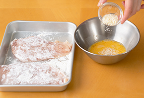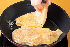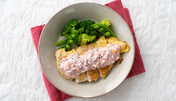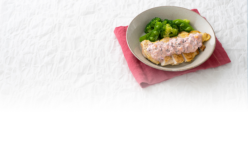 付け合わせを盛り、鶏むね肉を盛り付け、タルタルソースをかけて完成です。