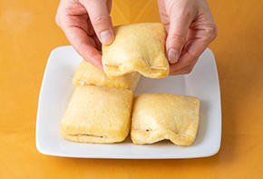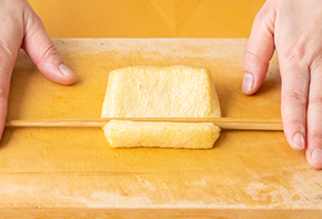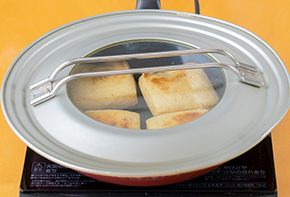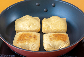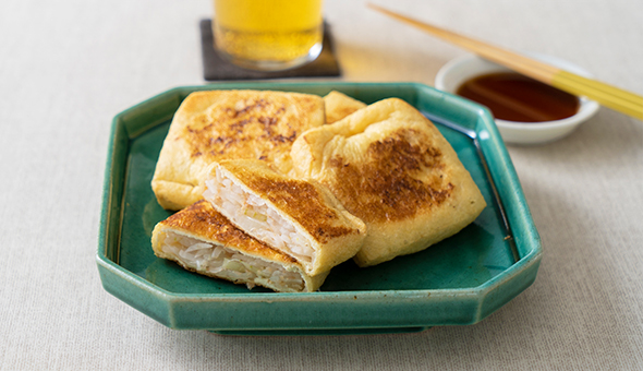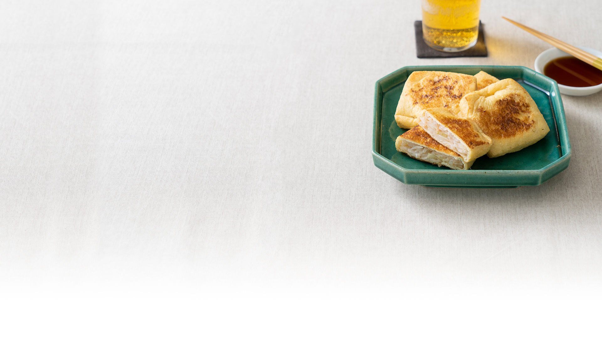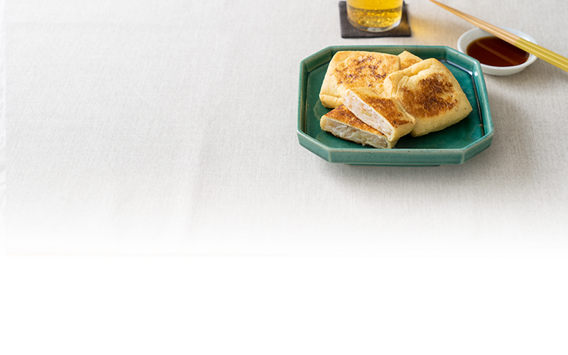 焼きあがったら爪楊枝をはずし、器に盛り付けて完成です。お好みでポン酢をつけていただきます。半分に切って盛るのも食べやすくて良いです。
