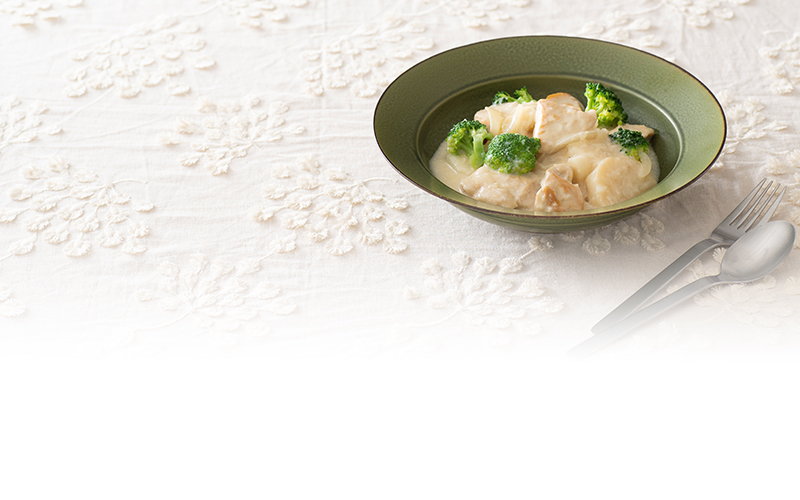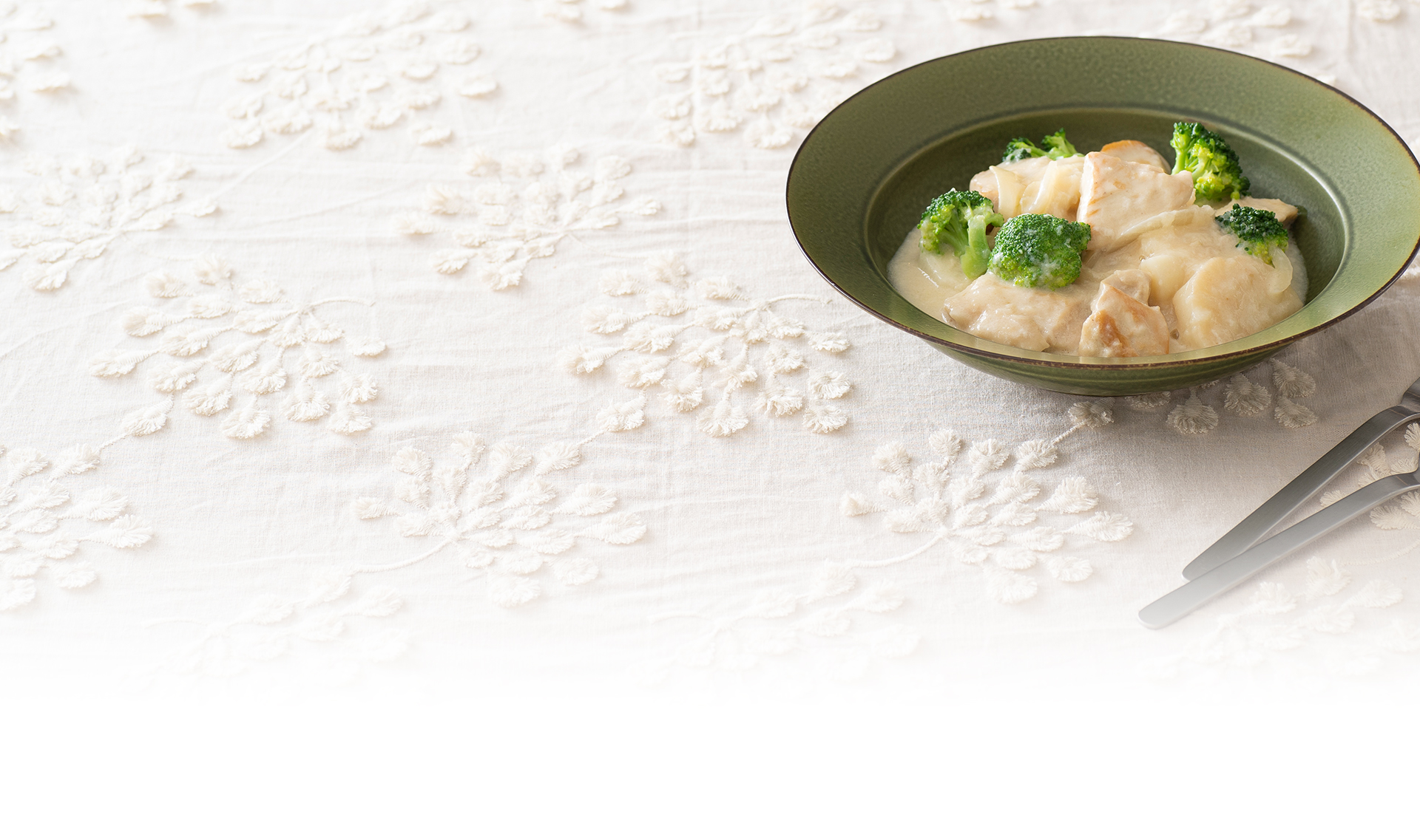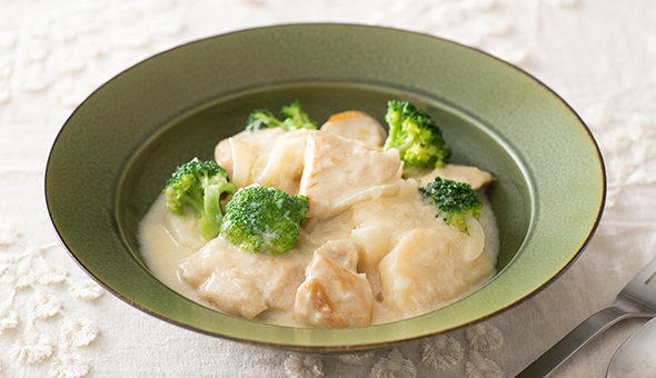 茹でたブロッコリーを絡めて器に盛ります。しょうゆを除き、塩・こしょうで味を調えてグルテンフリーに仕上げても。