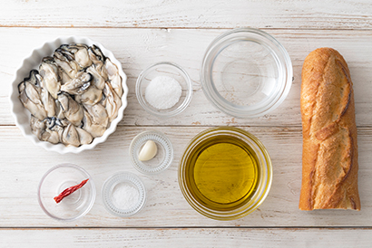 食べやすく切ったバゲットを一緒に用意して、牡蠣を乗せたり、オイルに浸していただきます。