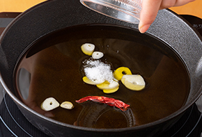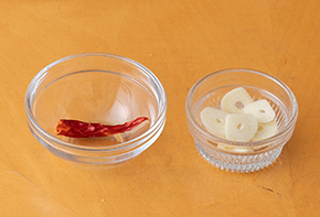 にんにくはスライスし、赤唐辛子は種を取っておきます。