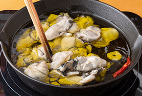 オリーブオイルがふつふつと沸いて塩が溶けたら、牡蠣を入れて弱火で5分程煮ます。