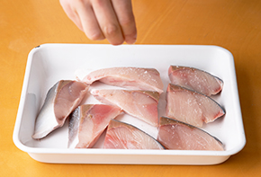 ブリに塩をしてしばらく置き、水分がでたらペーパータオルで拭き取ります。