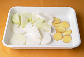 大根は皮をむいて1~1.5cm厚さの半月切りにします。生姜は洗って皮つきのまま薄切りにします。