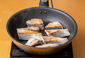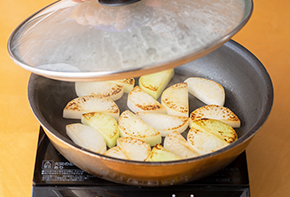 フライパンに油を熱して中火で大根を焼きます。焼き色がついたら裏返し、蓋をして弱火で5分蒸し焼きにします。