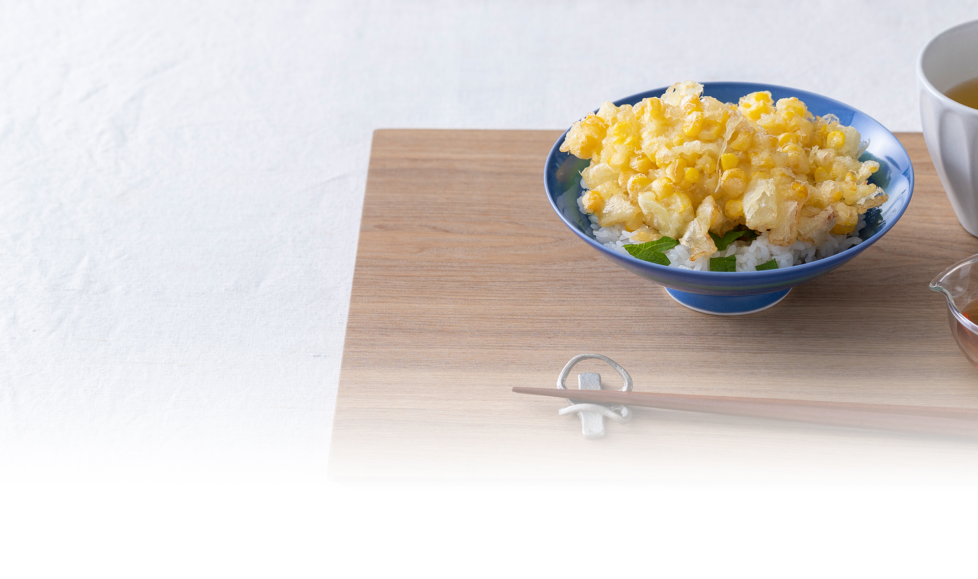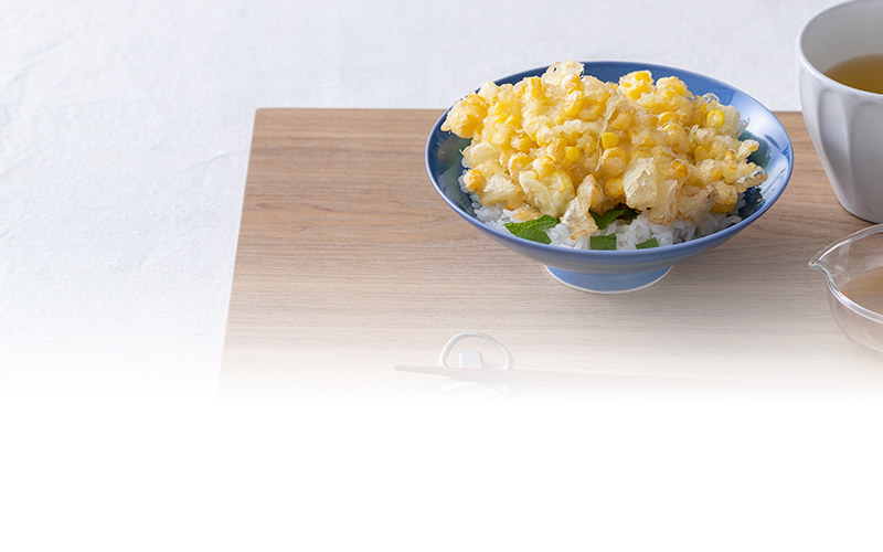 とうもろこしと玉ねぎのシンプルなかき揚げです。青しその香りでさっぱりといただだけます。