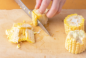 とうもろこしは4等分に切り、縦に包丁を入れて実を外します。