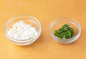 玉ねぎは1cm角に切り、青しその葉は正方形に切っておきます。