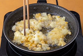 フライパンに油を2cm程入れて170℃に熱します。木べら等を使用して③の生地を入れて揚げます。