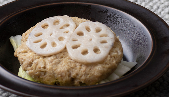耐熱皿に白菜と③を乗せ、片栗粉(分量外)をまぶした蓮根を上にのせます。