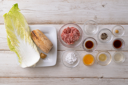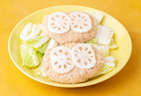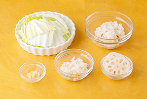 蓮根は皮をむいて4枚薄切りにします。残りはすりおろし、おろしきれなかった分はみじん切りにします。白菜はザク切りにして生姜はすりおろします。