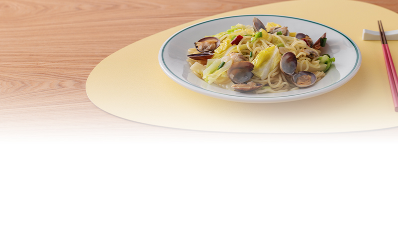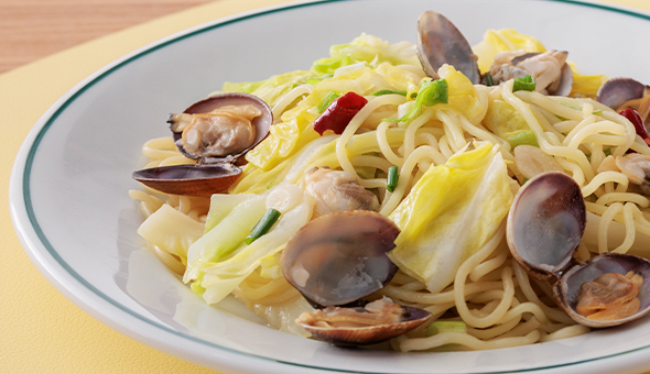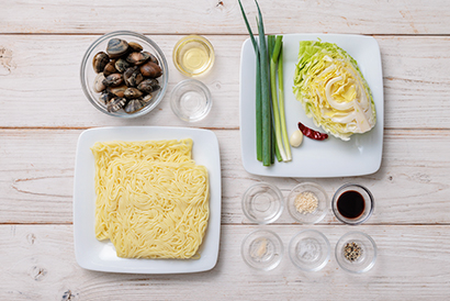 ⑤にキャベツを入れてさっと炒め、焼きそばの麺を入れ、あさりの蒸し汁を吸わせるように炒めたら、③と細ねぎを入れて混ぜ合わせます。