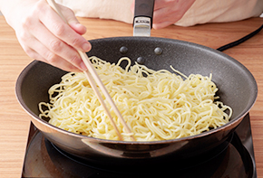 テフロン加工のフライパンを熱し、焼きそばの麺を入れます。水(分量外小さじ1~2)を入れてほぐし、焼いたら取り出します。