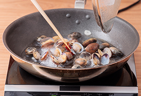 フライパンに油を熱し、にんにくを炒めます。にんにくの香りが出たらあさり、赤唐辛子と酒を入れて蓋をし、あさりの口が開くまで蒸します。