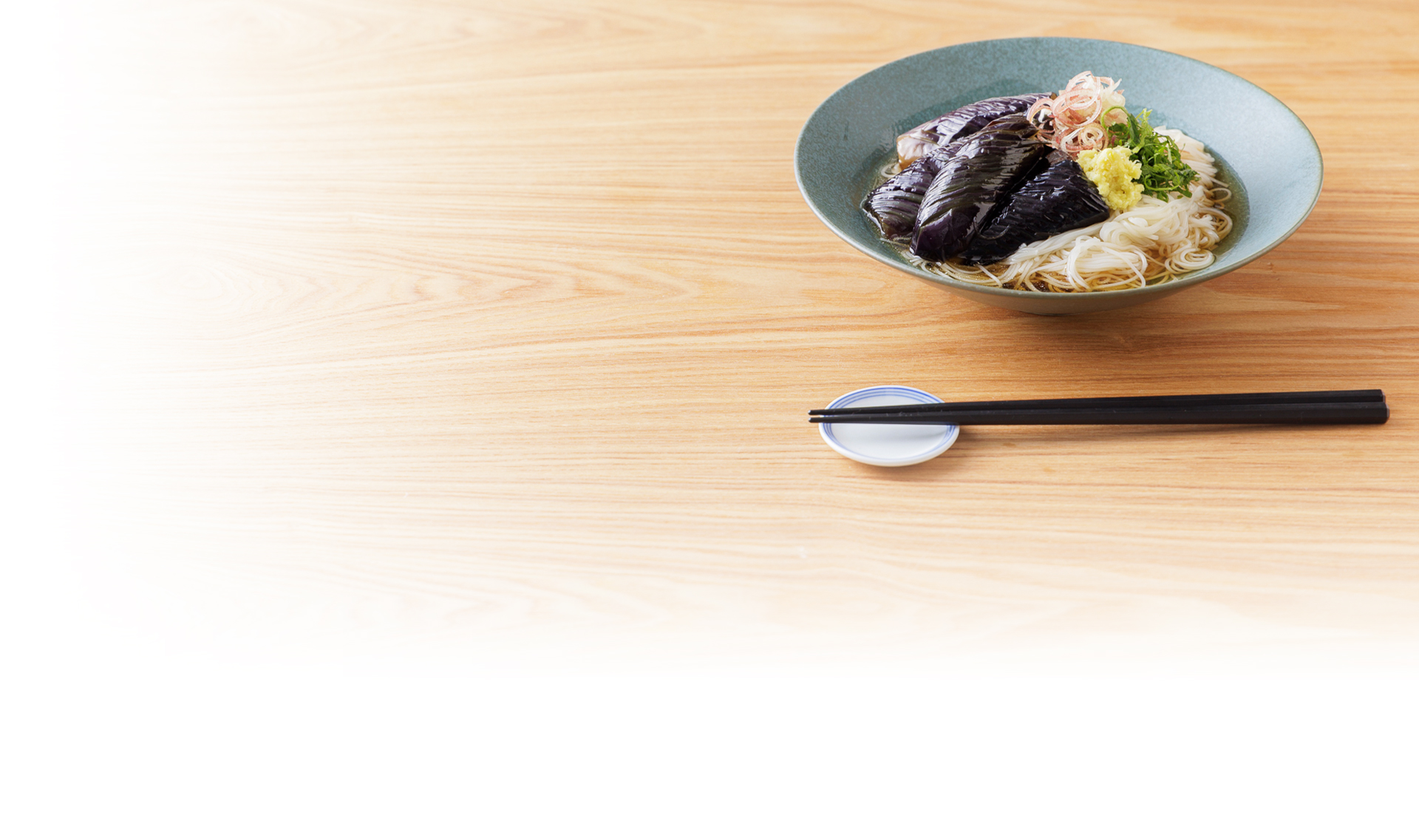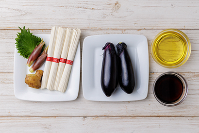 器にそうめん、茄子、薬味をのせ、茄子を浸けて置いためんつゆをお好みでかけます。