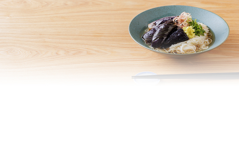 めんつゆを温め、揚げたてのなすを浸けて温かい状態でそうめんにかけるのもおすすめです。めんつゆの希釈はメーカーによって加減してください。
