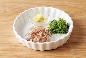 大葉は千切り、みょうがは薄切りにし、それぞれ水にさらして水気は切ります。生姜は皮をむいてすりおろします。