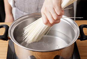 鍋に湯を沸かし、そうめんを表示通り茹で、冷やします。