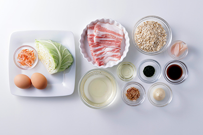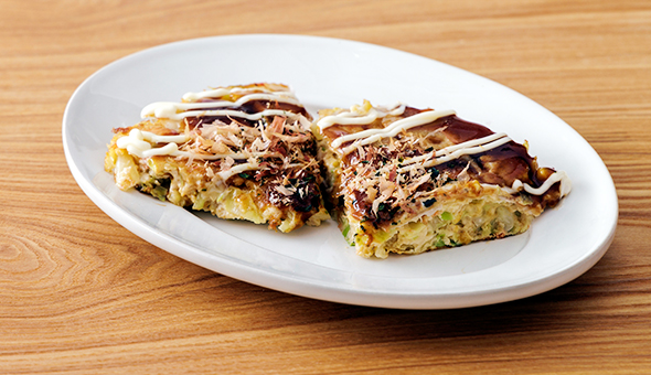 焼きあがったら器に盛り、お好み焼きソース、マヨネーズ、青のり粉、鰹節をかけ、新しょうがの漬物をせん切りにしたものを添えます。食べやすく切って盛り付けても良いでしょう。オートミールのメーカーによって生地が柔らかい場合は直径を小さめに焼くか、ヘラを2個使用して裏返すようにしてください。