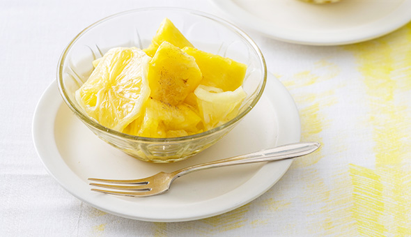 食べやすくカットしたパイナップルに、はちみつ、レモンにピリッと生姜を効かせた大人のマリネです。