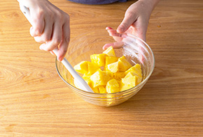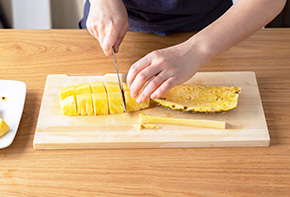 パイナップルは皮と芯を切り取り、食べやすい大きさに切ります。