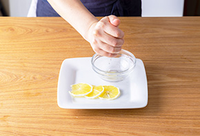 レモンは2~3枚スライスして皮を切り取り、残りは絞ってレモン汁にします。
